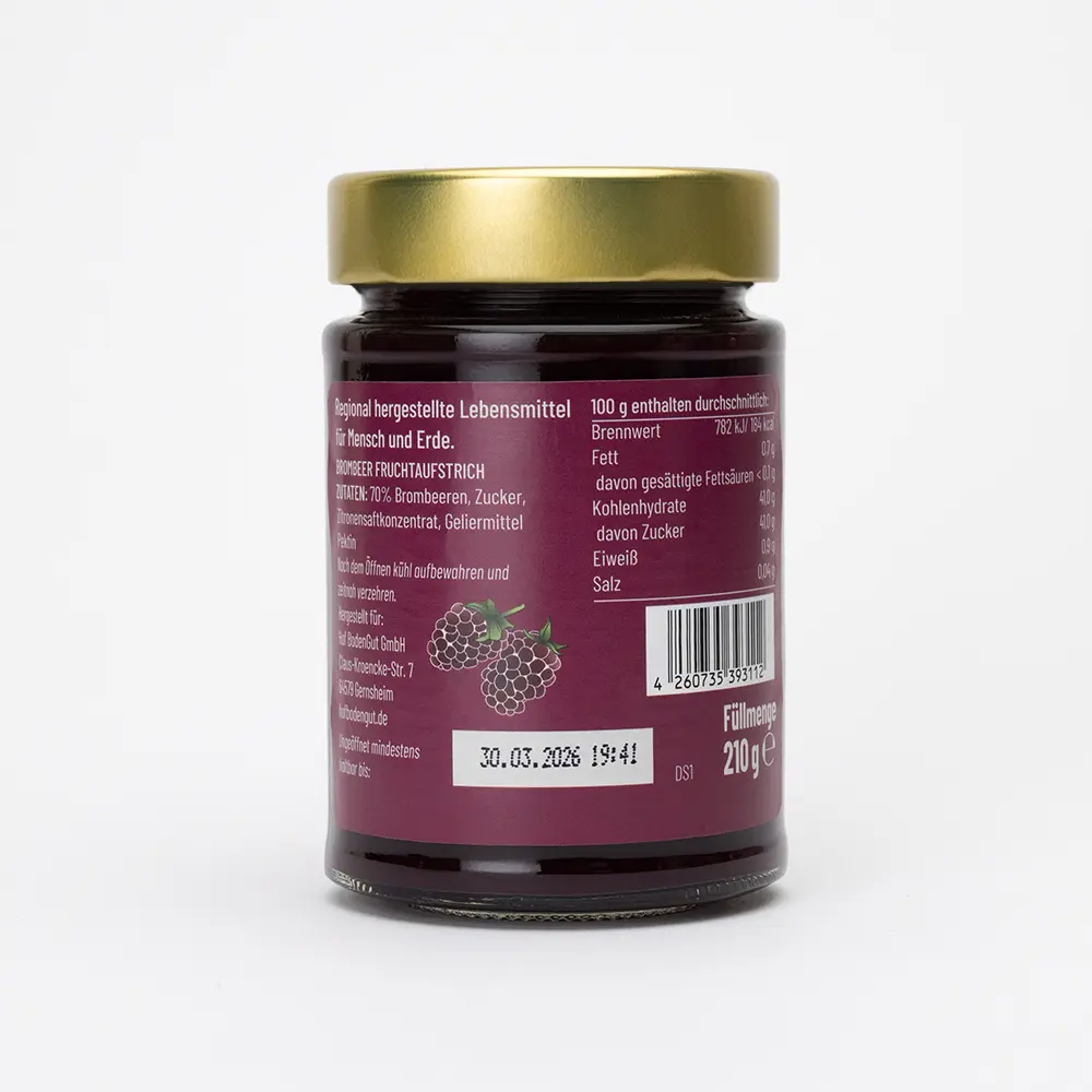 Zutaten: 70% Brombeeren, Zucker, Zitronensaftkonzentrat, Geliermittel, Pektin.