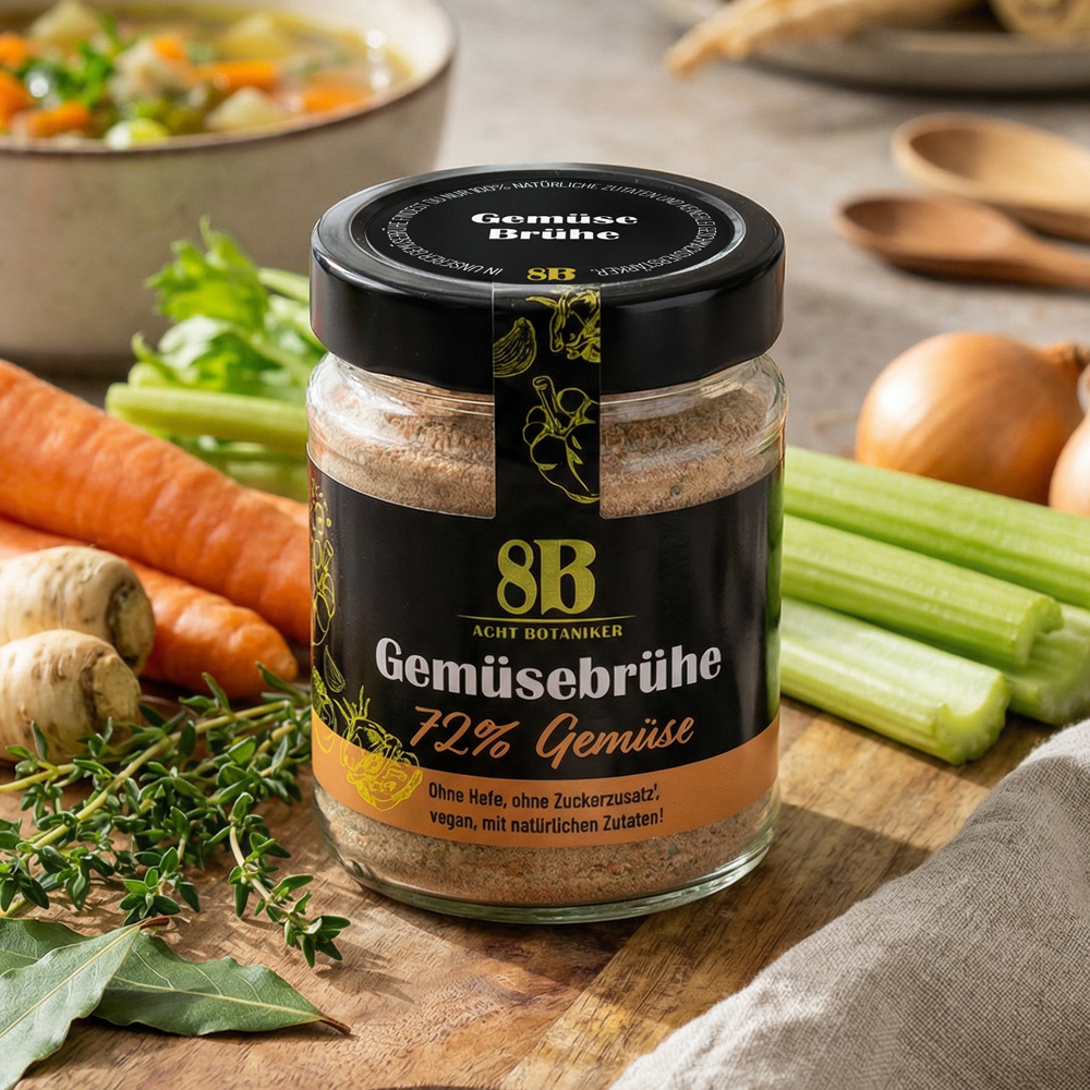 Eine gute Bolognese oder eine leckere Kürbissuppe sollte immer eine natürliche Würzbasis haben. Das haben schon die Landfrauen früherer Generationen gewusst und das Gemüse noch selbst geschnippelt, um einen leckeren Eintopf zu zaubern. Heut zu Tage muss alles manchmal etwas schneller gehen, der Trend der natürlichen Zutaten ist aber wieder aktuell. Unsere Gemüsebrühe wird daher komplett ohne Zuckerzusatz, ohne Hefe und mit 100% veganen und natürlichen Zutaten hergestellt. Bei 72% Gemüseanteil schmeckst du garantiert Tomate, Karotte oder Sellerie raus. Daher eignet sich die Gemüsebrühe auch ideal zum pur genießen.