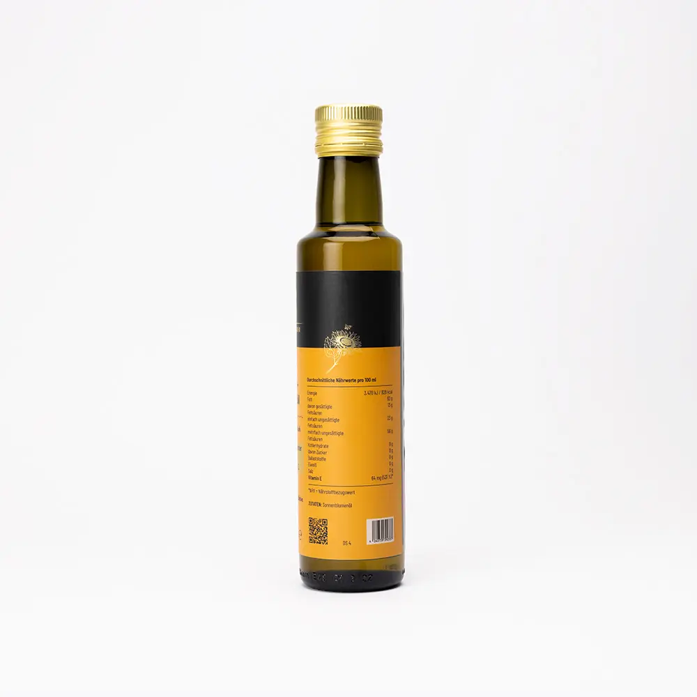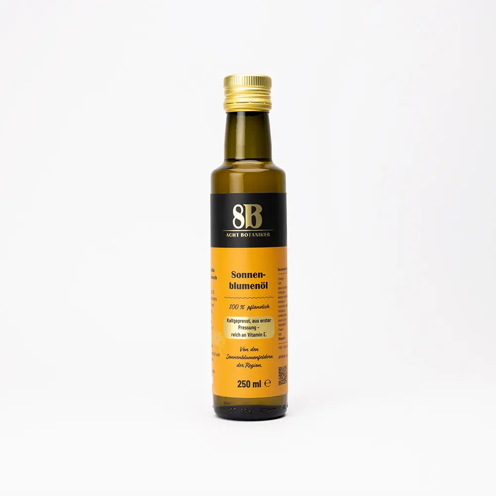 Im Frühjahr pflanzen wir unsere Sonnenblumen. Von Juli bis September erstrahlen sie auf den Feldern, bevor sie im Herbst, wenn sie dann die Köpfe hängen lassen, geerntet werden. Aus den hunderten abgeblühten Kernen pressen wir dann schonend unser kaltgepresstes Sonnenblumenöl – direkt in die Flasche, ganz ohne Umwege. Rein, natürlich und regional – für echten, nachhaltigen Geschmack in deiner Küche.