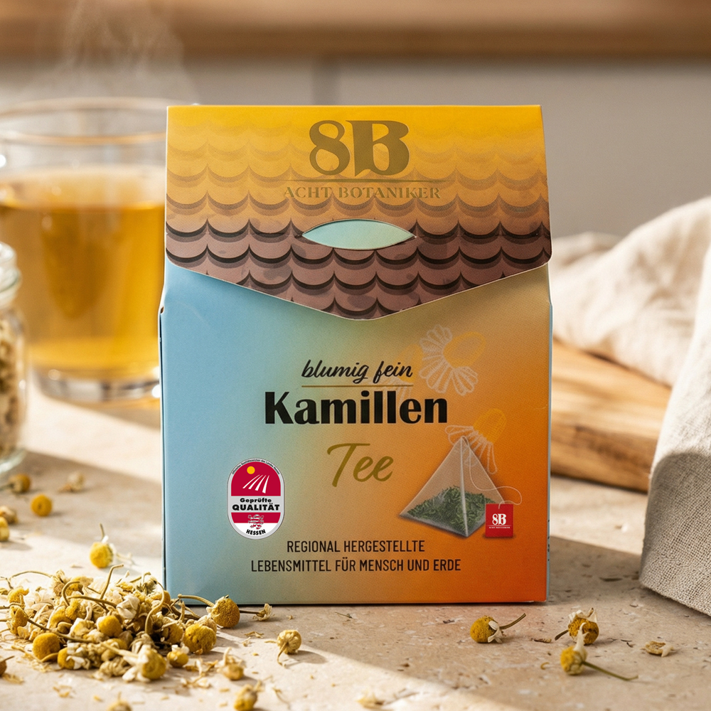 Auch in unseren, aus Maisstärke hergestellten Teebeuteln überzeugt unser Kamillentee mit der vollen Kraft der Pflanze. Hier findest du noch ganze Kamillenblüten, wie sie auf den Feldern in Südhessen geerntet wurden – für eine Qualität, die man schmeckt, riecht und auch sieht! Überzeuge dich selbst!
